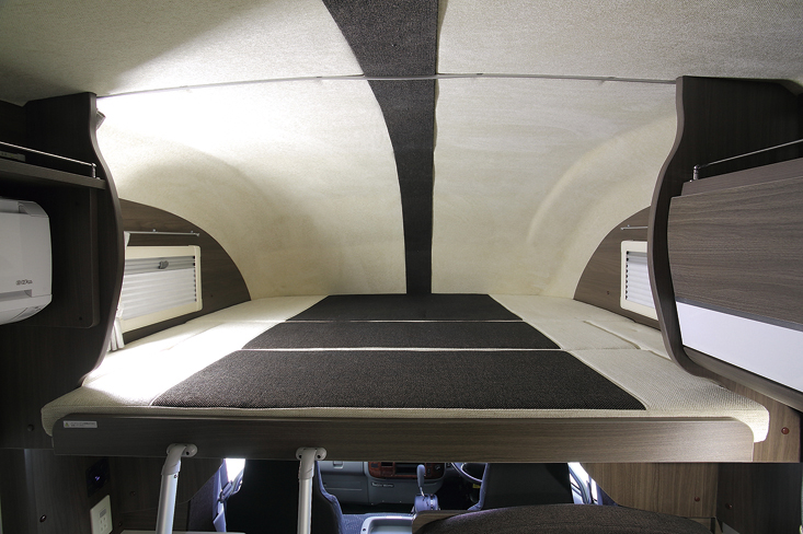 ゆったりとした窮屈感の無いダイネットは5.3Wの特徴の一つです。一人掛けシート(乗車定員含まず)にエントランスマットをはめ込むと二人がゆっくり座れるサイドソファーに展開します。大勢で使用するときはゲストベッドとして展開することも可能です。